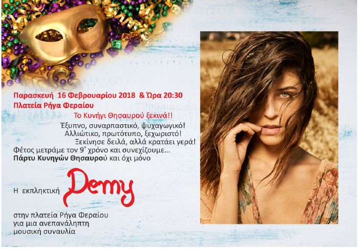 Βάση του προγράμματος των εκδηλώσεων για τις απόκριες στην Καλαμπάκα στις 20:30 το παιχνίδι του θησαυρού ξεκινά με πληροφορίες που θα δοθούν αλλά και με την εμφάνιση της γνωστής τραγουδίστριας DEMY σε μια μοναδική συναυλία που κοστίζει στον Δήμο Καλαμπάκας 4.340 ευρώ.