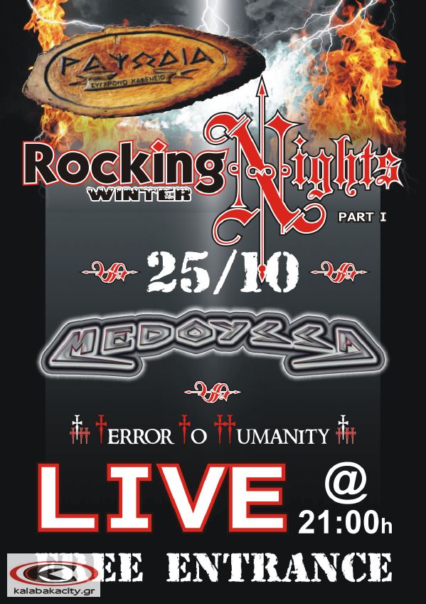 Όπως σας έχουμε αναφέρει το σύγχρονο καφενείο "Ραψωδία" έχει προγραμματίσει μια σειρά από ζωντανές εμφανίσεις των συγκροτημάτων που έλαβαν μέρος στο 5Th Rocking under the rocks Festival 2008. Η αρχή έγινε με τους Roxy Bitch και το Σάββατο 25 Οκτ. το βράδυ στις 21.00 θα εμφανιστούν οι "MEDOYSSA" και οι "Terror to Humanity".