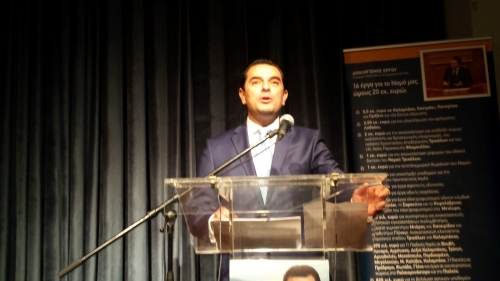 «Αγαπητές φίλες, αγαπητοί φίλοι… Χαίρομαι και συγκινούμαι γιατί ανάμεσά σας βλέπω πρόσωπα γνωστά, αγαπημένα, που μαζί δώσαμε πολλούς αγώνες, για πολλά χρόνια… Βλέπω όμως και νέα παιδιά που τώρα έρχονται κοντά μας προσδοκώντας από εμάς σε μια καλύτερη Ελλάδα… Χαίρομαι γιατί βλέπω όλους εσάς που μου δώσατε δύναμη με την ψήφο σας το 2012 να εκλεγώ βουλευτής και να σας εκπροσωπήσω. Να παλέψω για εσάς, να αγωνιστώ για τα δίκαιά σας, να αγωνιστώ για τον τόπο μας και την πατρίδα. Δεν θέλω να σας πω μεγάλα λόγια σήμερα, παρά μόνο ότι δούλεψα, δούλεψα πολύ για να καταφέρω το καλύτερο δυνατόν για τα αγαπημένα μας Τρίκαλα, αλλά και για την Ελλάδα… Δουλειά που αναγνωρίστηκε από τον ίδιο τον Πρωθυπουργό με την εμπιστοσύνη που μου έδειξε ορίζοντάς με υπουργό Ανάπτυξης… Και πιστέψτε με από τη πρώτη στιγμή που βρέθηκα σ’ αυτή τη θέση το μυαλό μου ήταν σε όλους εσάς, ήταν στον τόπο μας και στο πως θα μπορέσω από εκεί να βοηθήσω… Είμαι ευγνώμων απέναντί σας και δεσμεύομαι απέναντί σας ότι θα συνεχίσω να κάνω το πάν για να ανταποκρίνομαι στις προσδοκίες σας».