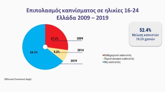 Σύμφωνα με στοιχεία της ΕΛΣΤΑΤ καταγράφεται εντυπωσιακή μείωση του καπνίσματος στην Ελλάδα κατά τη δεκαετία 2009 -2019. Συγκεκριμένα, ο επιπολασμός του καπνίσματος στον ενήλικα πληθυσμό το Σεπτέμβριο του 2019 είναι 24,9% για τους καθημερινούς καπνιστές (περισσότερο από ένα τσιγάρο την ημέρα), 3,7% και για τους περιστασιακούς καπνιστές (λιγότερο από 7 τσιγάρα την εβδομάδα). Συγκριτικά με αντίστοιχες μετρήσεις της ΕΛΣΤΑΤ σε 8.500 νοικοκυριά σε όλη την Ελλάδα κατά τα έτη 2009, 2014 και 2019, όπως απεικονίζεται στο συνημμένο διάγραμμα 1,