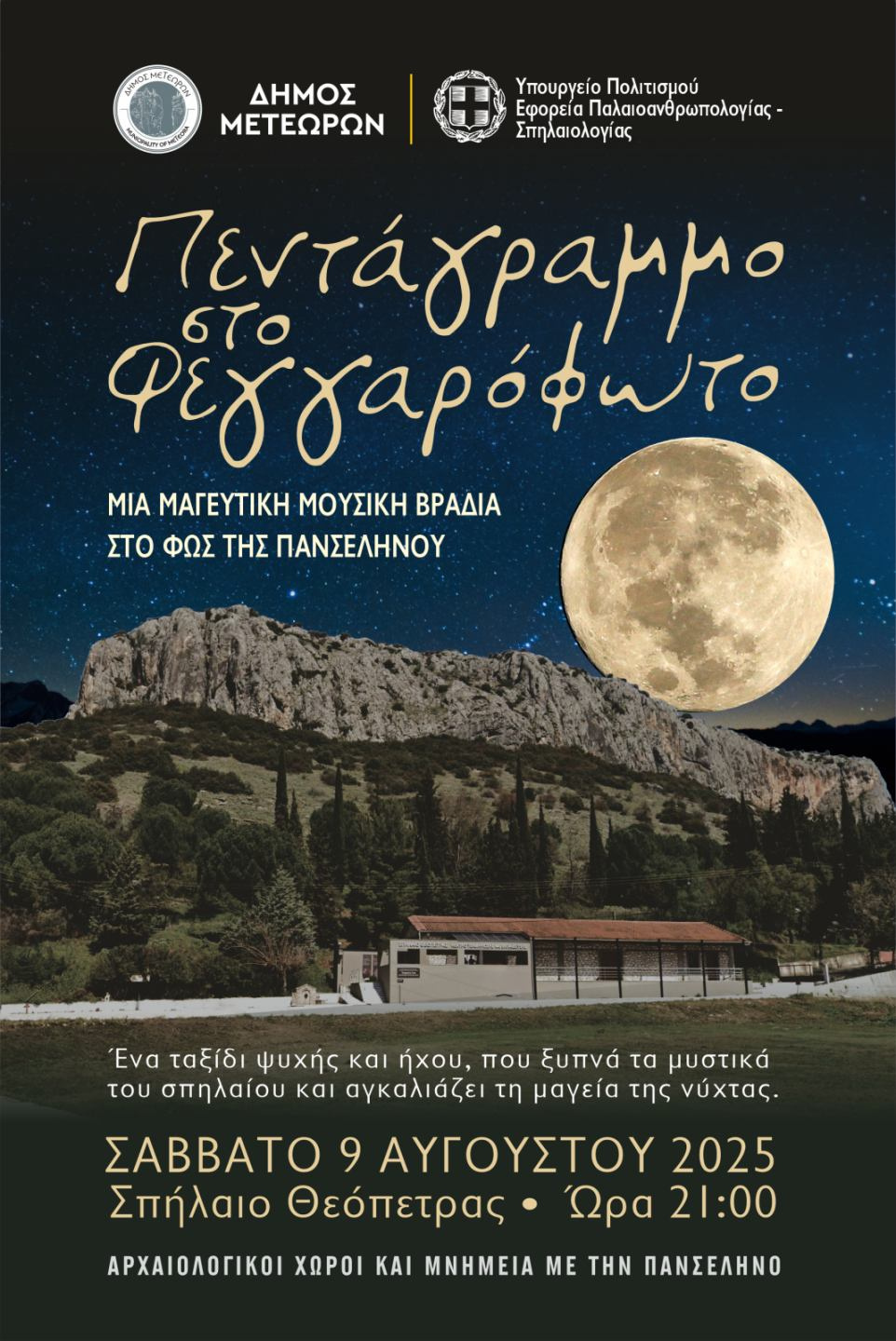 Μια μαγευτική βραδιά υπό το φως του φεγγαριού, όπου η μουσική συναντά τη φύση και ξυπνά τις αισθήσεις. Το Σάββατο 9 Αυγούστου 2025, στο εντυπωσιακό Σπήλαιο της Θεόπετρας, στον χώρο έμπροσθεν του Μουσείου, θα πραγματοποιηθεί η εκδήλωση «Πεντάγραμμο στο φεγγαρόφωτο», μια ξεχωριστή μουσική εμπειρία με φόντο τη μυστηριακή ατμόσφαιρα του σπηλαίου.