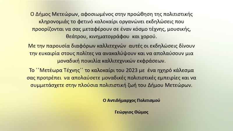 Το ΄΄Μετέωρα Τέχνης΄΄ το καλοκαίρι του 2023 με ένα ηχηρό κάλεσμα σας προτρέπει να απολαύσετε μοναδικές πολιτιστικές εμπειρίες και να συμμετάσχετε στην πλούσια πολιτιστική ζωή του Δήμου Μετεώρων.