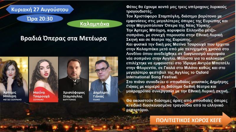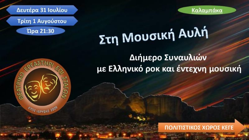 Ο Δήμος Μετεώρων, αφοσιωμένος στην προώθηση της πολιτιστικής κληρονομιάς το φετινό καλοκαίρι οργανώνει εκδηλώσεις που προορίζονται να σας μεταφέρουν σε έναν κόσμο τέχνης, μουσικής, θεάτρου, κινηματογράφου και χορού.