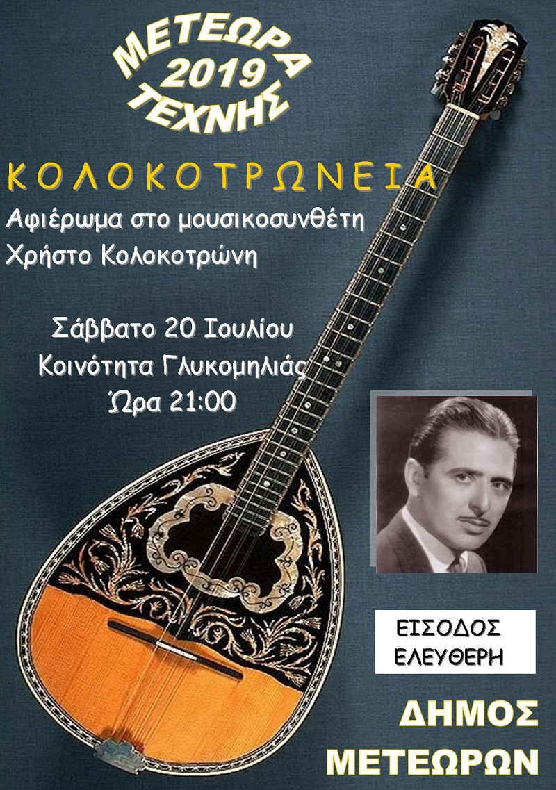 Με την μουσική βραδιά «Κολοκοτρώνεια», συνεχίζονται οι εκδηλώσεις του ΜΕΤΕΩΡΑ ΤΕΧΝΗΣ 2019, αύριο Σάββατο 20 Ιουλίου και ώρα 21:00 στην Κοινότητα Γλυκομηλιάς.
