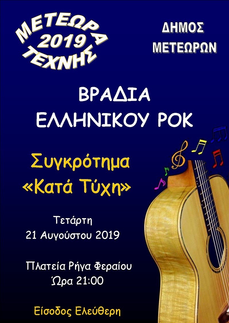 Σας περιμένουμε όλους στην καρδιά της πόλης, στην Πλατεία Ρήγα Φεραίου, κάτω από τους επιβλητικούς βράχους των Μετεώρων, να τραγουδήσουμε μαζί με το συγκρότημα «Κατά Τύχη», αξέχαστες επιτυχίες καταξιωμένων τραγουδιστών της ελληνικής ΡΟΚ μουσικής σκηνής.