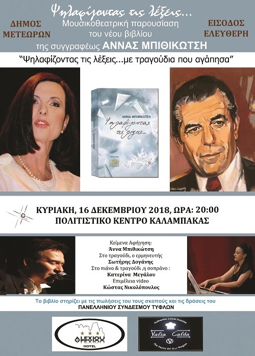 Οι εορταστικές εκδηλώσεις του «ΜΕΤΕΩΡΩΝ ΔΩΔΕΚΑΜΕΡΟ» συνεχίζονται σήμερα, με την παρουσίαση του νέου βιβλίου της Άννας Μπιθικώτση «Ψηλαφίζοντας τις λέξεις… με τραγούδια που αγάπησα».