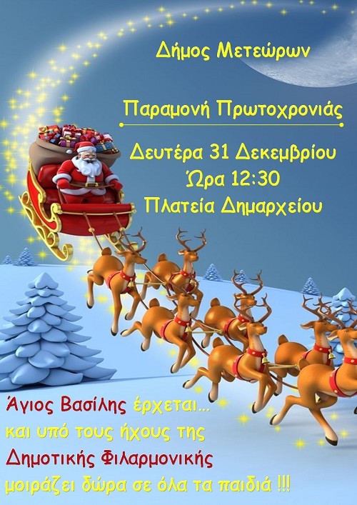 Οι εορταστικές εκδηλώσεις του «Μετεώρων Δωδεκάμερο» συνεχίζονται αύριο, Δευτέρα 31/12 Παραμονή Πρωτοχρονιάς, στην Πλατεία Δημαρχείου, όπου στις 12:30, υπό τους ήχους της Φιλαρμονικής του Δήμου Μετεώρων, θα έρθει ο Άγιος Βασίλης και θα μοιράσει δώρα σε όλα τα παιδιά.