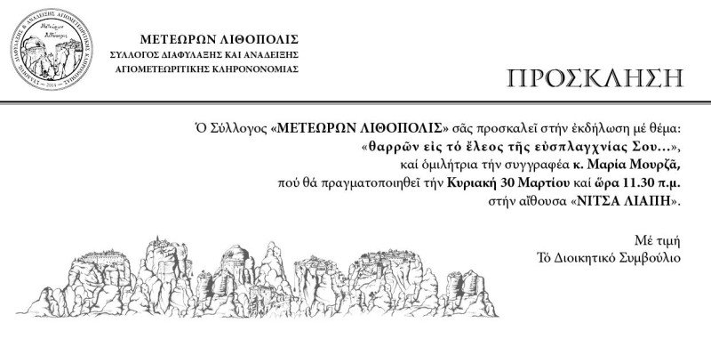 Ὁ Σύλλογός μας, σᾶς προσκαλεῖ στήν ἐκδήλωση μέ θέμα: «θαρρῶν εἰς τό ἔλεος τῆς εὐσπλαγχνίας Σου…», καί ὁμιλήτρια τήν συγγραφέα κ. Μαρία Μουρζᾶ, πού θά πραγματοποιηθεῖ τήν Κυριακή 30 Μαρτίου καί ὥρα 11.30 π.μ. στήν αἴθουσα «ΝΙΤΣΑ ΛΙΑΠΗ».