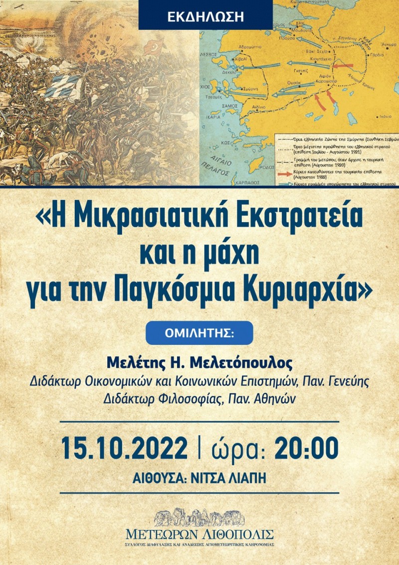 Ὁ Σύλλογος «ΜΕΤΕΩΡΩΝ ΛΙΘΟΠΟΛΙΣ» σᾶς προσκαλεῖ στήν ἐκδήλωση μέ θέμα: «Ἡ Μικρασιατική ἐκστρατεία καί ἡ μάχη γιά τήν παγκόσμια κυριαρχία», μέ ὁμιλητή τόν γνωστό Καθηγητή – Διδάκτορα κ. Μελέτη Μελετόπουλο, πού θά πραγματοποιηθεῖ τό Σάββατο 15 Ὀκτωβρίου καί ὥρα 8.00 μ.μ. στήν αἴθουσα «ΝΙΤΣΑ ΛΙΑΠΗ».