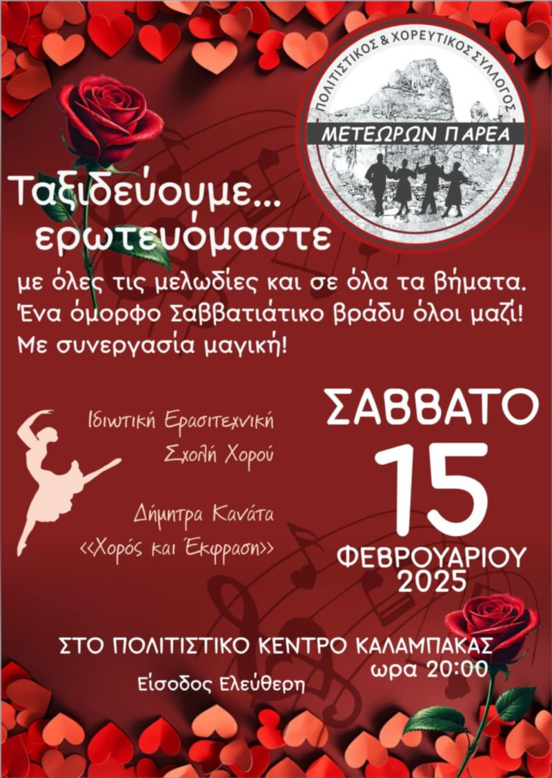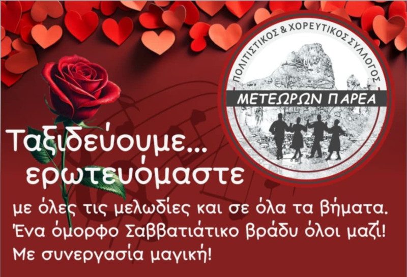 Μέσα σε όμορφη ατμόσφαιρα, γεμάτη μελωδίες και βήματα ο Σύλλογος “Μετεώρων Παρέα” και η Σχολή Χορού “Χορός και Έκφραση” σας προσκαλούν το Σάββατο 15 Φεβρουαρίου και ώρα 20:00 στο Πολιτιστικό Κέντρο Δ. Μετεώρων, σε ένα όμορφο ταξίδι ζευγαρωτών χορών του κόσμου και της Πατρίδας μας!!!!