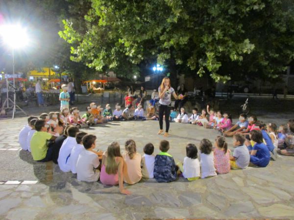 Από την πρώτη κιόλας στιγμή γίναμε όλοι, μικροί και μεγάλοι, μία όμορφη παρέα. Τα παιδιά συμμετείχαν ενεργά στην αφήγηση, έπαιξαν μαζί μου διάφορα παιχνίδια, τραγούδησαν, χόρεψαν και, στο τέλος, ζωγράφισαν κάτω από τον έναστρο ουρανό και τον πανύψηλο πλάτανο της πλατείας του χωριού.
