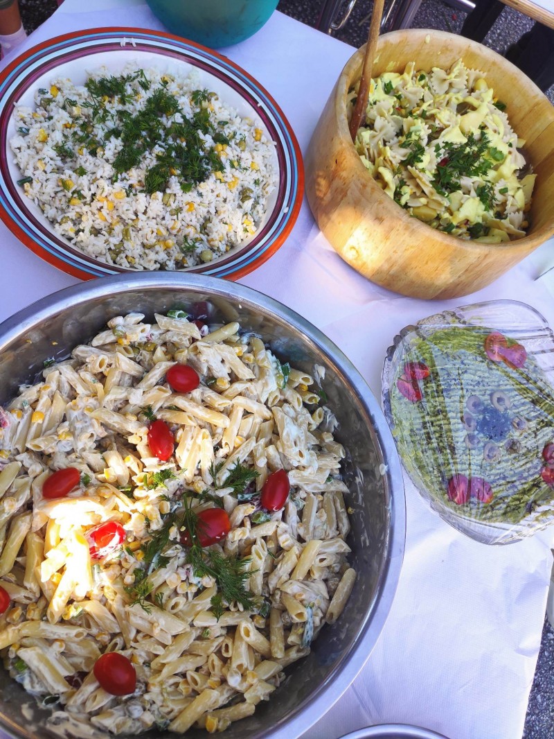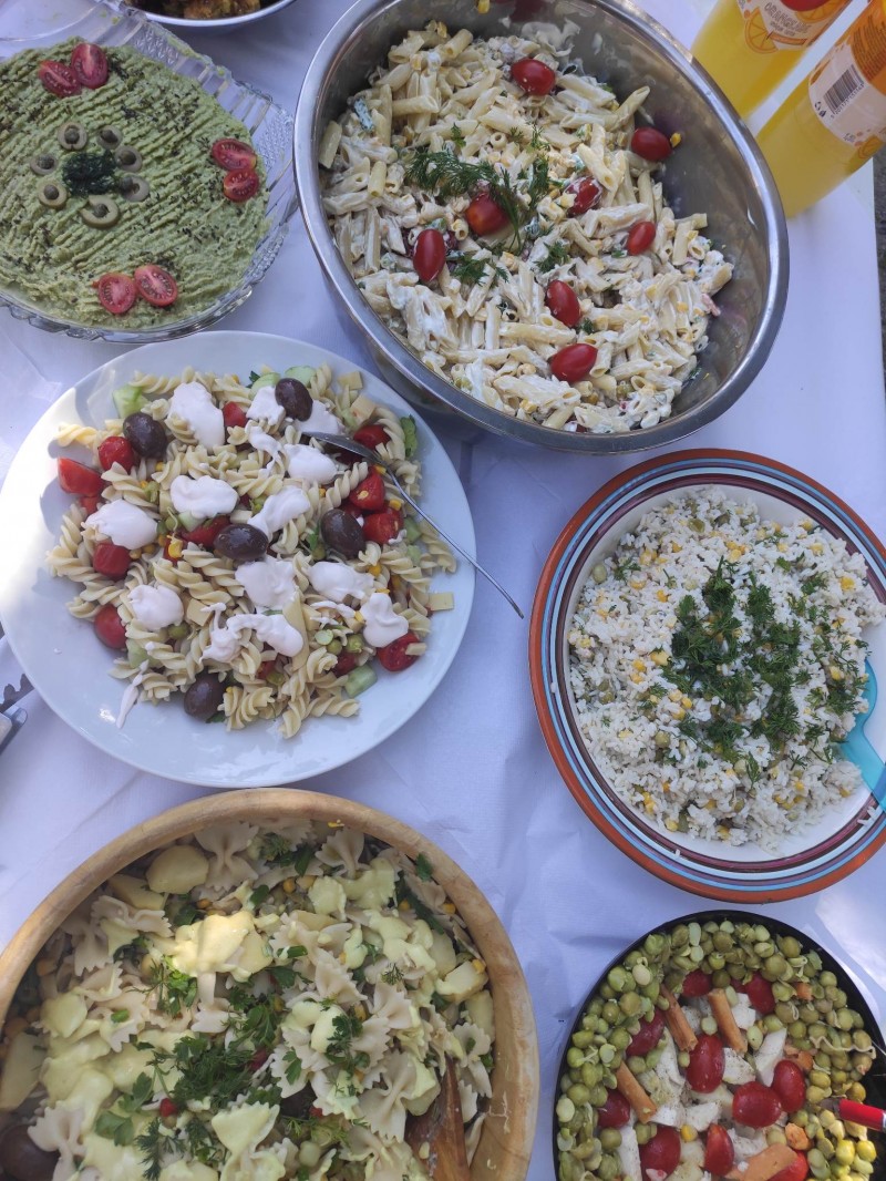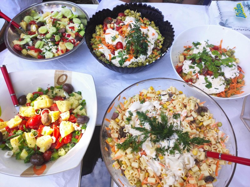 Άφθονα τα λαχανικά, γενναιόδωρα χαρισμένα από τον σχολικό μας κήπο που καθημερινά φροντίζαμε. Πλούσια η ποσότητα του αρακά επίσης! Έτσι κυριάρχησε σχεδόν σε κάθε σαλάτα.