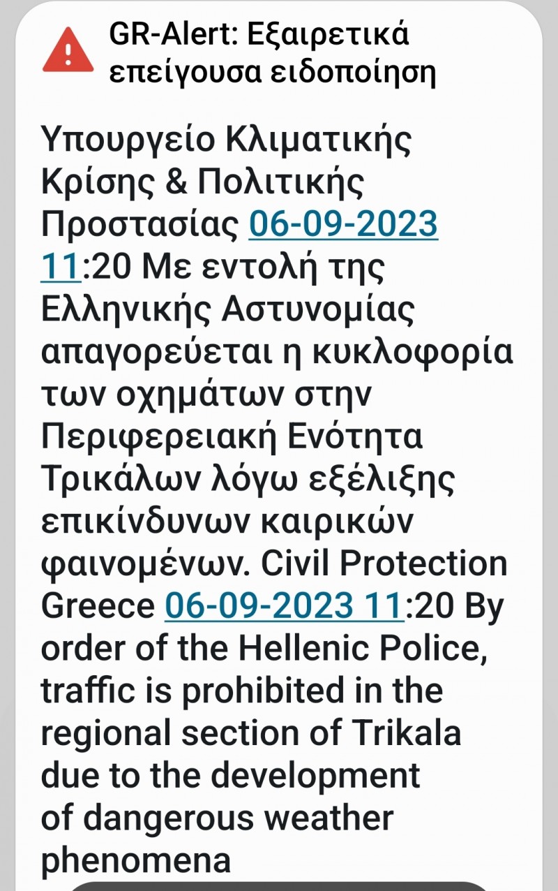 Με εντολή της Ελληνικής Αστυνομίας απαγορεύεται η κυκλοφορία στο Νομό Τρικάλων λόγω εξέλιξης επικίνδυνων καιρικών φαινομένων.