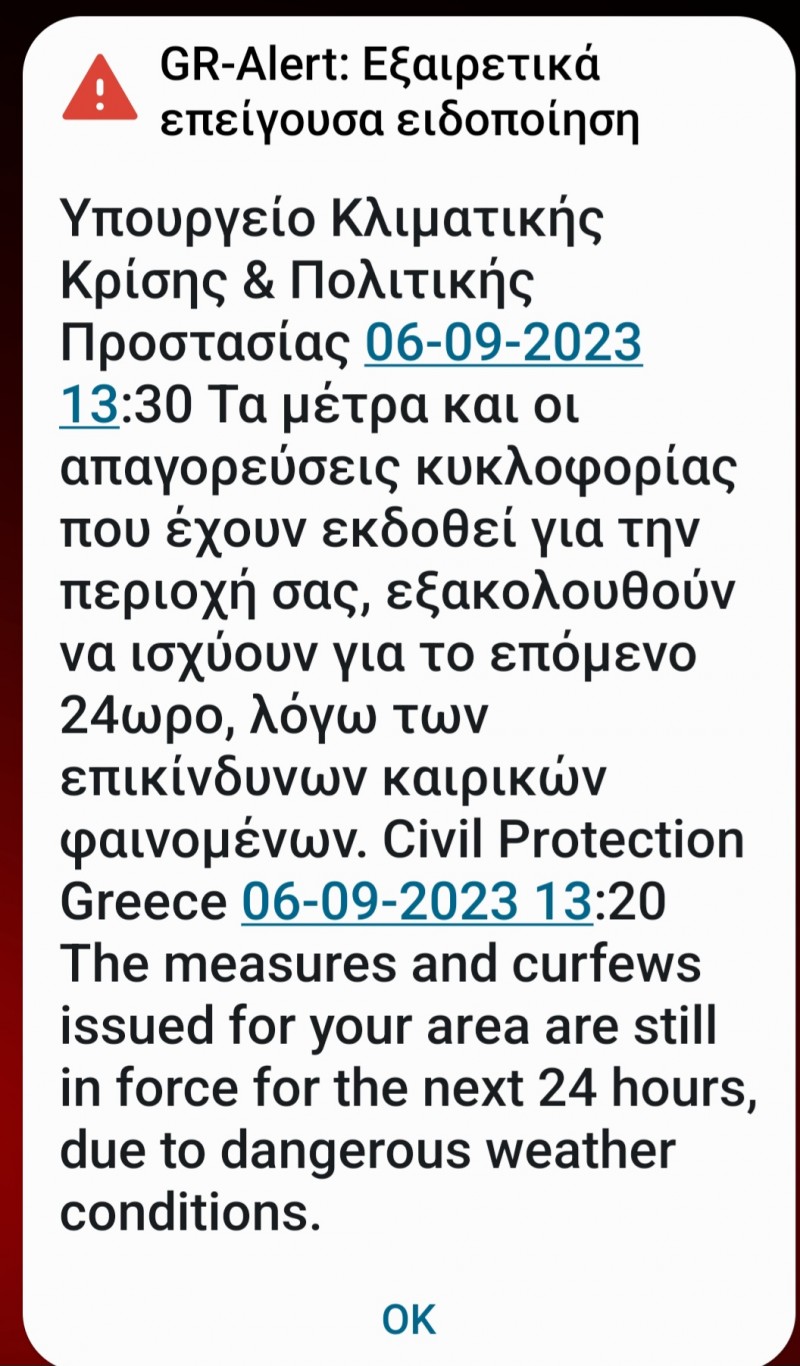 Εξαιρετικά επείγουσα ειδοποίηση – Υπουργείο Κλιματικής Κρίσης & Πολιτικής Προστασίας 06-09-2023 13:30