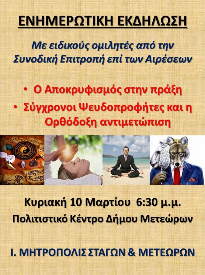 Την Κυριακή των Απόκρεω, 10 Μαρτίου, στις 6:30 μ.μ., στο Πολιτιστικό Κέντρο του Δἠμου Μετεώρων, θα λάβει χώρα εκδήλωση που οργανώνει η Ιερά Μητρόπολις Σταγών και Μετεώρων, με σκοπό την ενημέρωση και την προφύλαξη των συμπολιτών μας από το επικίνδυνο σύγχρονο φαινόμενο των παραθρησκειών και της πλάνης-ψευδοπροφητείας.