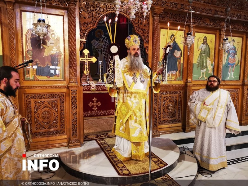 Ο κ. Θεόκλητος, που ιερούργησε πλαισιωμένος από τον πρωτοσύγκελο π. Νήφωνα Καψάλη, τους ιερείς του ναού και τους διακόνους της μητροπόλεως, ανέφερε πως «η εκκλησία αυτές τις ημέρες, όλους εμάς τους χριστιανούς, μας καλεί σε μια συνάντηση με επίκεντρο το Χριστό. Αδιακρίτως της κοινωνικής μας τάξης, του πολιτικού μας χρώματος και της προσωπικής μας ιδεολογίας».