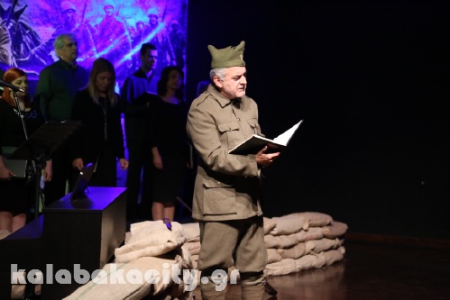 Το επετειακό αφιέρωμα καθήλωσε τους παρευρισκόμενους που κατέκλυσαν το Πολιτιστικό Κέντρο καθώς περιελάμβανε θαετρικά κείμενα με αναφορά στα γεγονότα του 40′ με τραγούδια από την χορωδία του “Επι Σταγών”, την καταπληκτική φωνή της Ιφιγένειας Καραγκούνη με την συνοδεία στο πιάνο του μουσικού Γιώργου Αδάμου, των Σαράντη Μούτο και Κώστα Δριτσέλη, από την Λιάνα Μίνια με την παιδική χορωδία του Δ. Καλαμπάκας και τους μουσικούς που πλαισίωναν την εκδήλωση Δημήτρη Αδάμο, Ελένη Μαυρομάτη, Κώστα Λάμπα, Νεκτάριο Παπαγεωργίου και Θωμά Μαυραντζά, Κώστα Δριτσέλη.