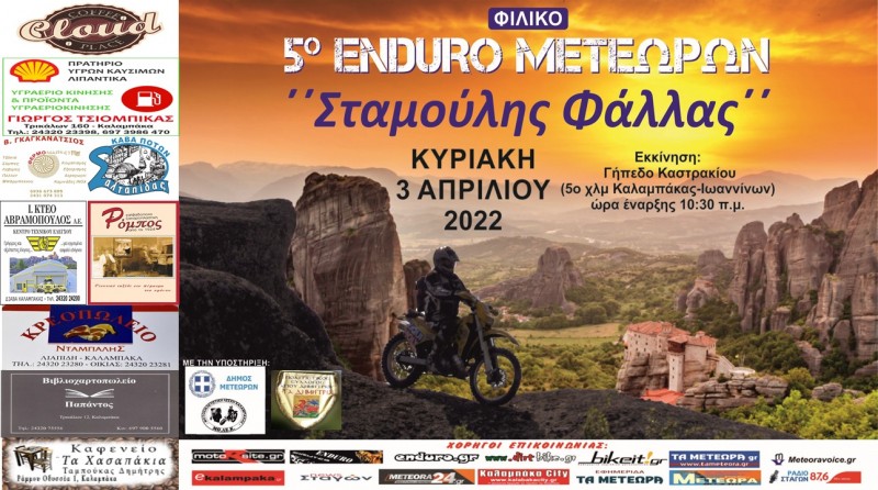 Με μεγάλη επιτυχία πραγματοποιήθηκε από τη ΜΟ.ΛΕ.Κ την Κυριακή 03/04/2022, το 5ο Enduro Μετεώρων “Σταμούλης Φάλλας” , με ρεκόρ συμμετοχών. Από την Παρασκευή το βράδυ οι συμμετέχοντες είχαν αρχίσει να καταφθάνουν , προσέλευση η οποία συνεχίστηκε και το Σάββατο με αποτέλεσμα παντού στην πόλη να είναι εμφανής η δυναμική που αναπτύχθηκε γύρω από την διοργάνωση. Στο πάρκινγκ της Δημοτικής Αγοράς εισήλθαν 100+ μοτοσυκλέτες και η γραμματεία της οργάνωσης κατέγραψε τους έως τότε συμμετέχοντες που ξεπέρασαν τους 240 .Την Κυριακή στο γήπεδο του Α.Ο Καστρακίου όπου ήταν και η εκκίνηση , προσήλθαν ακόμα 310 συμμετέχοντες , φτάνοντας έτσι στον αριθμό ‘ρεκόρ’ των 550+ αναβατών . Αναβάτες από όλη την Ελλάδα , από την Καλαμάτα εως την Αλεξανδρούπολη, αλλά και εκτός των συνόρων , αφού μας τίμησαν 7 αναβάτες από την Βουλγαρία και 2 από την Κροατία , συνέθεσαν αυτο το «πολύβουο μελίσσι» που ξεχύθηκε την Κυριακή για να βολτάρει στην υπεροχή διαδρομή που σχεδιάστηκε από την ΜΟ.ΛΕ.Κ.