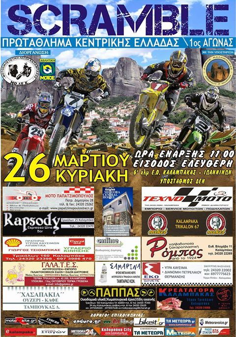 Το Αθλητικό Σωματείο ΜΟ.ΛΕ.Κ (Μοτοσυκλετιστικη Λέσχη Καλαμπάκας) ,μετά από έγκριση της Αθλητικής ΜΟΤΟΕ διοργανώνει τον 1ο Αγώνα SCRAMBLE για το Πρωτάθλημα Κεντρικής Ελλάδας 2017 ο οποίος θα διεξαχθεί την Κυριακή 26 ΜΑΡΤΙΟΥ 2017 στην Καλαμπάκα.