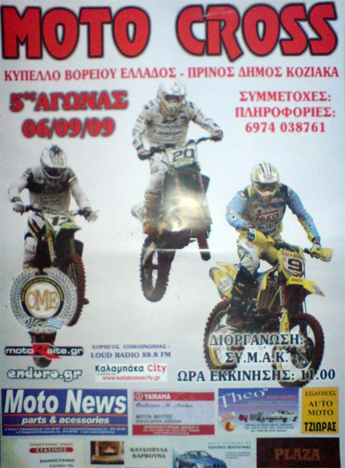 Ο 5ος αγώνας Moto Cross θα πραγματοποιηθεί την Κυριακή 6 Σεπτεμβρίου στο Πρίνος του Δήμου Κόζιακα από τον Σύλλογο Μοτοσικλετιστών Αγώνων Κόζιακα. Στον αγώνα θα τρέξει ο συμπολίτης μας Κώστας Τζιώρας. Ώρα εκκίνησης του αγώνα στις 11 το πρωί και όσοι μπορείτε ας παρευρεθείτε στην πίστα του Πρίνους για ένα μοναδικό θέαμα.