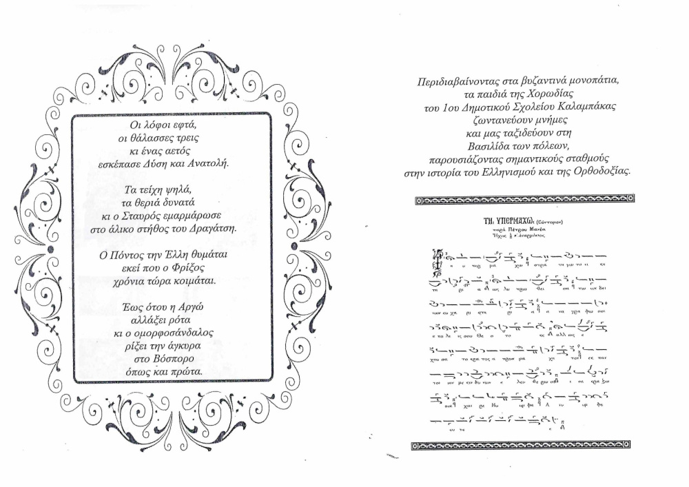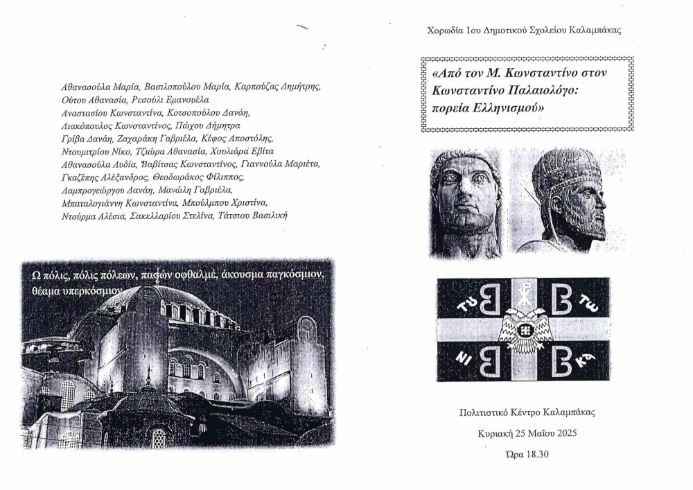 Η χορωδία του 1ου Δημοτικού σχολείου Καλαμπάκας την Κυριακή 25-5-2025 και ώρα 18.30 στο Πολιτιστικό κέντρο του δήμου Μετεώρων θα ζωντανέψει μνήμες και θα μας ταξιδέψει στην Βασιλίδα των πόλεων, μέσα από την μουσική εκδήλωση: ‘’Από τον Μ. Κωνσταντίνο στον Κωνσταντίνο Παλαιολόγο: πορεία Ελληνισμού.’’