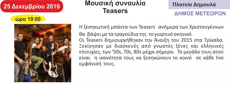Η ξεσηκωτική μπάντα των Teasers ανήμερα των Χριστουγέννων θα βάψει με τα τραγούδια της το γιορτινό σκηνικό.