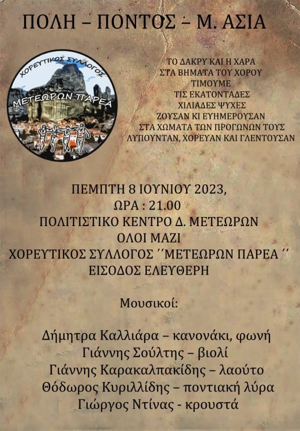 Μουσικοχορευτική Εκδήλωση ΄΄Μετεώρων Παρέα ΄΄ : ΠΟΛΗ – ΠΟΝΤΟΣ – Μ. ΑΣΙΑ
