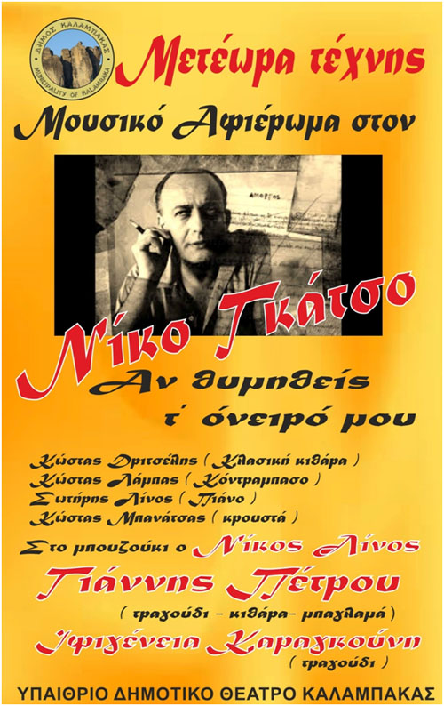 Εκδήλωση αφιερωμένη στον Νίκο Γκάτσο θα πραγματοποιηθεί την Πέμπτη 23 Ιουλίου στις 9 το βράδυ στο υπαίθριο θέατρο Καλαμπάκας, στα πλαίσια του Μετέωρα Τέχνης 2015.