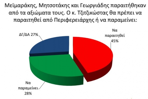 Στη σχετική ερώτηση, το 45% απαντάει ότι ο Απόστολος Τζιτζικώστας θα έπρεπε να έχει παραιτηθεί, και μόλις το 28% στηρίζει την επιλογή του να παραμείνει στη θέση του.
