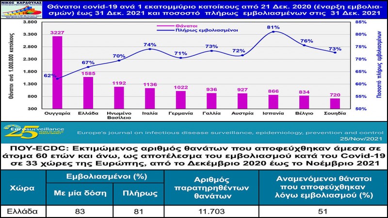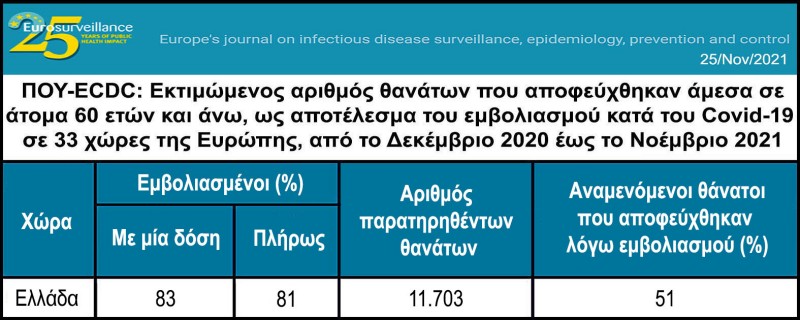 Η κοινή μελέτη του ΠΟΥ και του ECDC (https://www.eurosurveillance.org/content/10.2807/1560-7917.ES.2021.26.47.2101021) διεξήχθη σε 33 χώρες της Ευρώπης, από τις 21/12/2020, όταν άρχισαν οι εμβολιασμοί, μέχρι και τις 07/11/2021, εκτίμησε τον αριθμό θανάτων που αποφεύχθηκαν άμεσα σε άτομα 60 ετών και άνω ως αποτέλεσμα του εμβολιασμού covid-19, δημοσιεύθηκε στις 25/11/2021 και για την Ελλάδα τα συμπεράσματα ήταν: