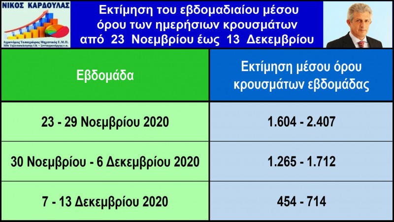 - Τέλος, την εβδομάδα 7 έως 13 Δεκεμβρίου ο εβδομαδιαίος μέσος όρος των ημερήσιων κρουσμάτων θα κυμαίνεται από 454 έως 714 κρούσματα, ενώ τις τελευταίες ημέρες της εβδομάδας τα ημερήσια κρούσματα θα είναι κάτω από 500, γεγονός που θα σημάνει την άρση του lockdown τη Δευτέρα 14 Δεκεμβρίου.