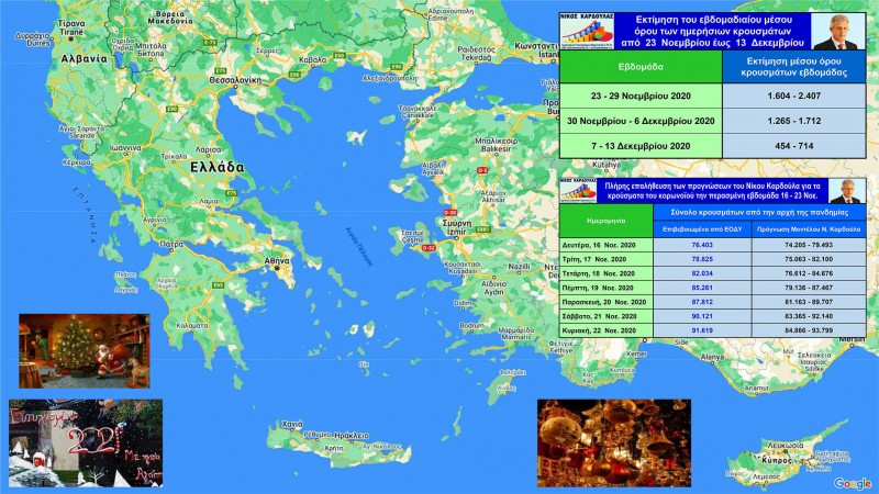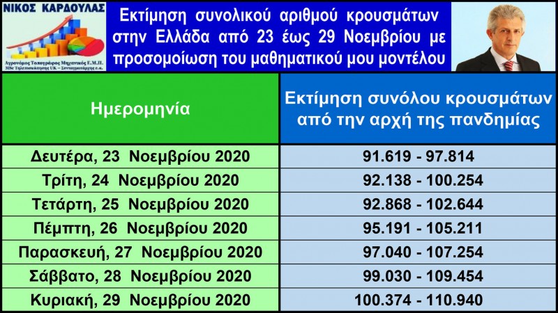 Εκτιμάται ότι την τρέχουσα εβδομάδα, η πανδημία θα βρίσκεται σε καθοδική πλέον πορεία, τα ημερήσια κρούσματα θα παρουσιάσουν μια σταθερή και σταδιακή υποχώρηση και στο τέλος της τρέχουσας εβδομάδας την Κυριακή 29 Νοεμβρίου, ο συνολικός αριθμός των κρουσμάτων από την αρχή της πανδημίας εκτιμάται ότι θα ξεπεράσει τις 100.000 και θα κυμαίνεται από 100.374 έως 110940 κρούσματα. Η διακύμανση των τιμών των προβλέψεων οφείλεται στο στατιστικό σφάλμα του μοντέλου, που είναι ±5%.