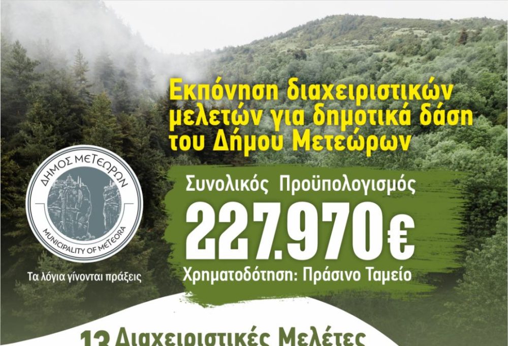 Νέα σημαντική χρηματοδότηση εξασφάλισε ο Δήμος Μετεώρων μετά από έγκριση του Πράσινου Ταμείου για την εκπόνηση διαχειριστικών μελετών δημοτικών δασών, συνολικού προϋπολογισμού 227.970 ευρώ.
