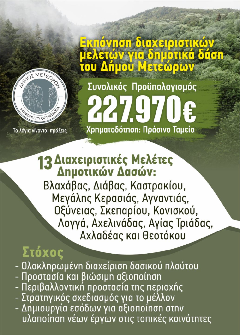 Το έργο αφορά την εκπόνηση 13 διαχειριστικών μελετών για τα δημοτικά δάση των κοινοτήτων Βλαχάβας, Διάβας, Καστρακίου, Μεγάλης Κερασιάς, Αγναντιάς, Οξύνειας, Σκεπαρίου, Κονισκού, Λογγά, Αχελινάδας, Αγίας Τριάδας, Αχλαδέας και Θεοτόκου. Στόχος της συγκεκριμένης παρέμβασης είναι η ολοκληρωμένη και ορθολογική διαχείριση του δασικού πλούτου του Δήμου Μετεώρων, η προστασία του φυσικού περιβάλλοντος και η βιώσιμη αξιοποίησή του. Παράλληλα, μέσω του στρατηγικού σχεδιασμού που θα προκύψει από τις μελέτες, δημιουργούνται οι προϋποθέσεις για την αξιοποίηση των δασικών πόρων, με σημαντικά οφέλη για τις τοπικές κοινότητες.