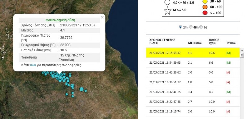 Νέα εκτίμηση του Γεωδυναμικού Ινστιτούτου, η μετασεισμική δόνηση ήταν 4,1 Ρίχτερ με εστιακό βάθος τα 10 χλμ 15 χλμ ΝΝΔ της Ελασσόνας.