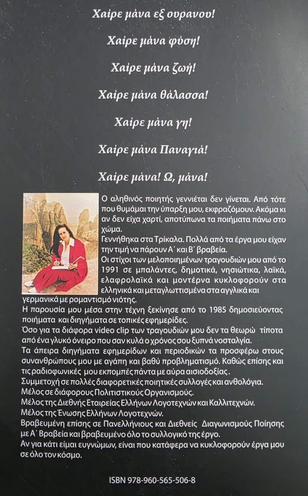 Συγχαρητήρια στην αγαπητή μας φίλη, την καλλιτεχνική ψυχή της Καλαμπάκας, για αυτή την συγκινητική προσθήκη στο πλούσιο βιογραφικό της — με δημιουργικό πάθος και αισθητική ευαισθησία, συνεχίζει να μας μαγεύει μέσα από τον λόγο της.
