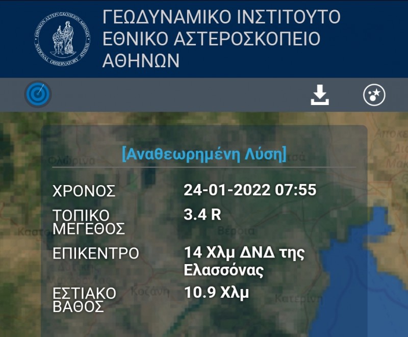 Η δόνηση είχε επίκεντρο 14 χιλιόμετρα δυτικά, νοτιοδυτικά της Ελασσόνας όπου και έγινε αισθητή.