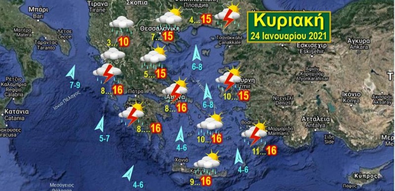 Κυριακή, 24-1-2021 Το πρωί συννεφιά, βροχές και σποραδικές καταιγίδες στην ανατολική Στερεά, την Εύβοια, την ανατολική Μακεδονία, τη Θράκη, το βόρειο και ανατολικό Αιγαίο με γρήγορη βελτίωση και ηλιοφάνεια.