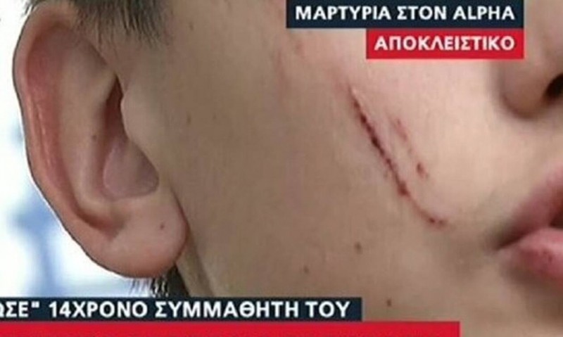«Άρχισε να με χτυπάει με τα κλειδιά κι εγώ τον χτύπησα πίσω και αυτός με πλάκωσε. Με χαράκωσε με τα κλειδιά. Τρόμαξα λίγο γιατί είχε μικρή απόσταση γενικά με το μάτι μου. Και επίσης δεν το έκανε μόνο σε μένα αλλά και σε άλλα παιδιά αλλά δεν είναι τόσο άσχημα όσο σε μένα», λέει ο μαθητής με το σημάδι να είναι εμφανές στο πρόσωπό του.