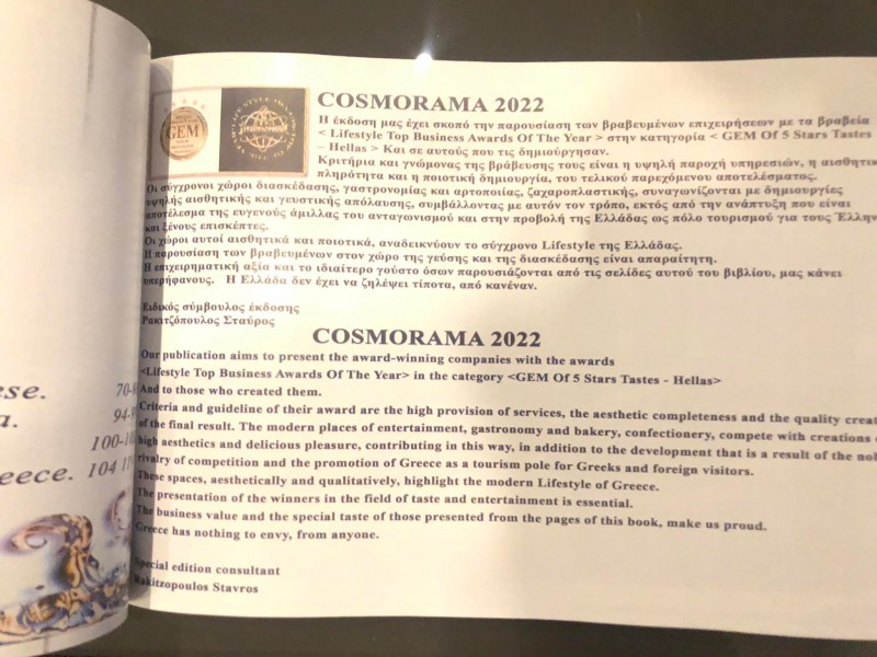 Μετά από απαιτούμενη έρευνα και αξιολόγηση που έγινε από τους πελάτες της, η Ταβέρνα ΠΑΡΑΜΥΘΙ της Καλαμπάκας βραβεύτηκε και εντάχθηκε στις 50 καλύτερες ταβέρνες στην Ελλάδα με βάση τα Greek Awards Hellas και φιγουράρει στην ειδική έκδοση που κυκλοφορεί COSMORAMA WORLD 2022 με τις καλύτερες ελληνικές επιχειρήσεις.