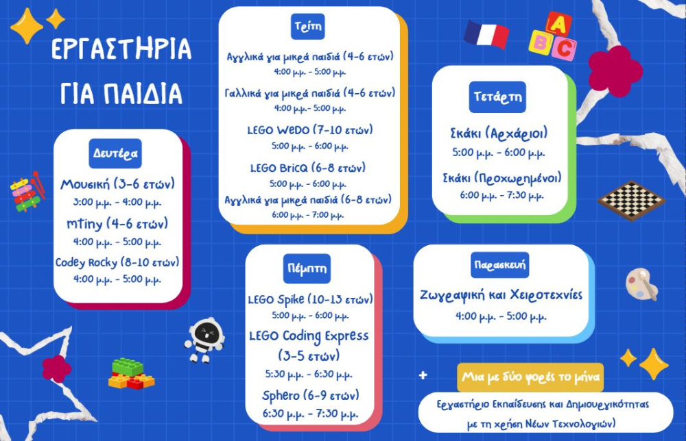 - Εργαστήριο Νέων Τεχνολογιών: Δημιουργία και μάθηση με σύγχρονα εργαλεία και τεχνολογίες.