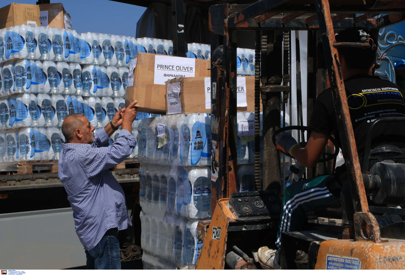 με μπουκάλια νερού 1,5 λίτρου καθως και κούτες με ρουχισμο για τους πληγέντες συμπολίτες μας.