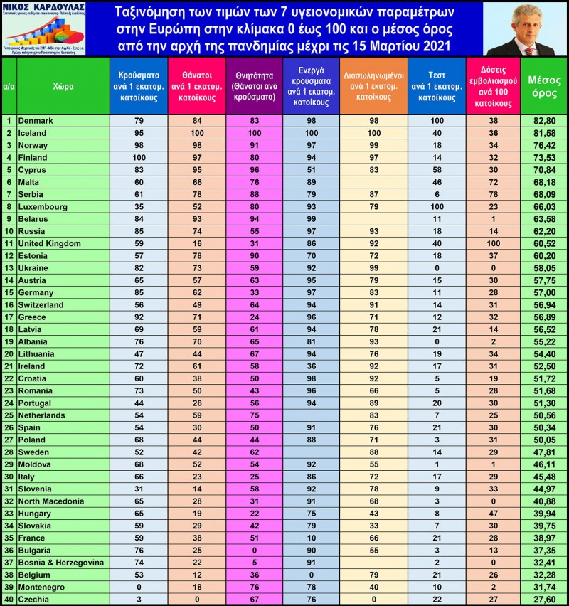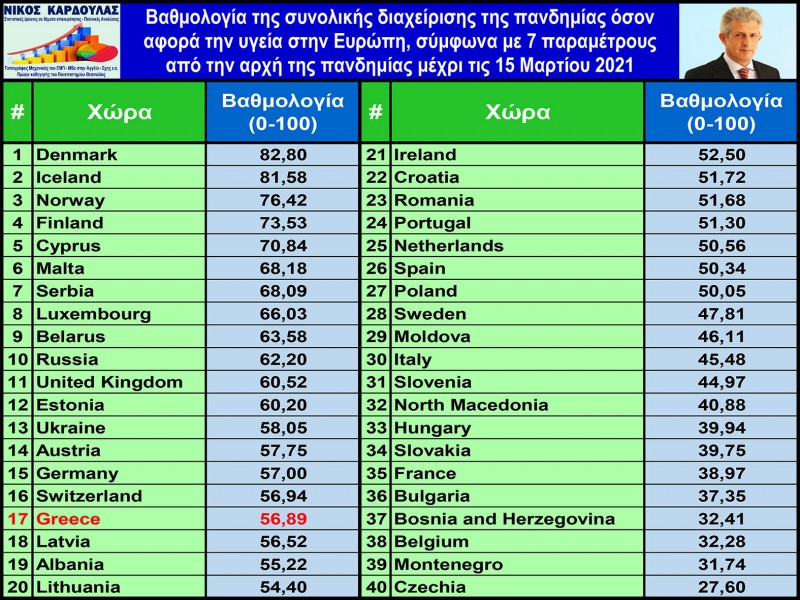 Συγκρίνοντας επτά παραμέτρους που επηρεάζουν τη δημόσια υγεία λόγω της πανδημίας, έγινε κατάταξη των ευρωπαϊκών χωρών όσον αφορά τη συνολική διαχείριση της πανδημίας στον τομέα της υγείας.