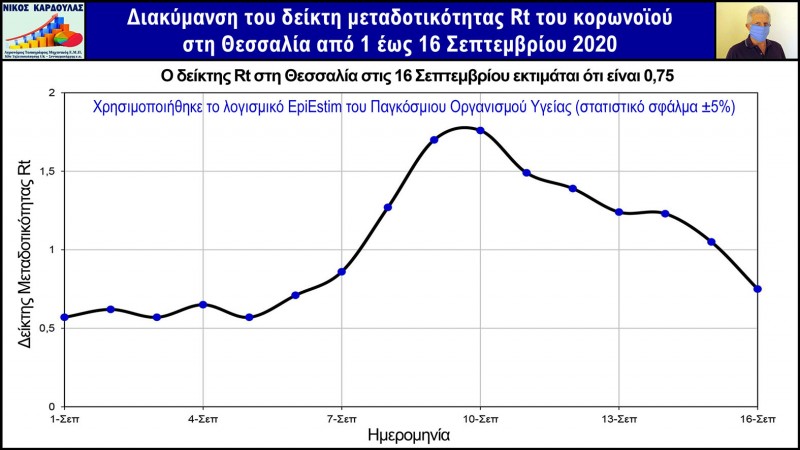 Στο παραπάνω γράφημα φαίνεται ότι ο δείκτης Rt ενώ στις 1 Σεπτεμβρίου ήταν 0.57, στις 10 Σεπτεμβρίου είχε την υψηλότερη τιμή 1.76 και στις 16 Σεπτεμβρίου υποχώρησε κάτω του 1 στο 0.75, γεγονός που σημαίνει ότι η Θεσσαλία βρίσκεται μεταξύ χαμηλού και μετρίου επιδημιολογικού κινδύνου.