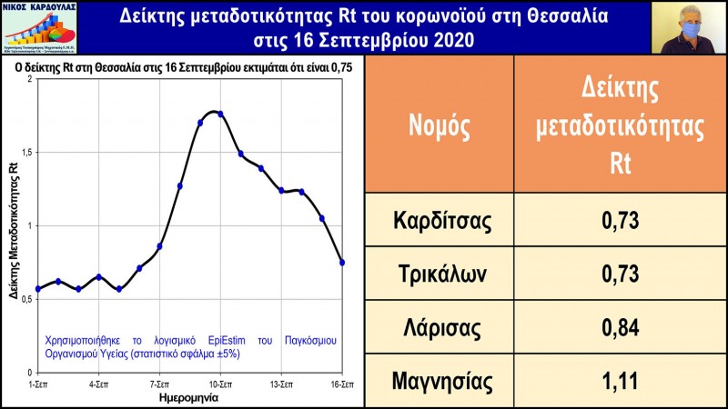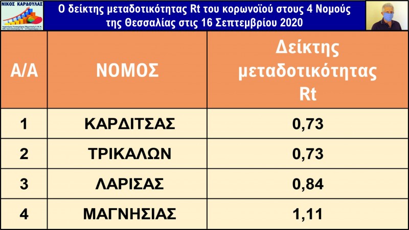 Ο δείκτης μεταδοτικότητας Rt στους Νομούς της Θεσσαλίας στις 16 Σεπτεμβρίου 2020, δείχνει ότι οι Νομοί Λάρισας, Τρικάλων και Καρδίτσας βρίσκονται μεταξύ χαμηλού και μετρίου επιδημιολογικού κινδύνου και ο Νομός Μαγνησίας σε μέτριο επιδημιολογικό κίνδυνό.