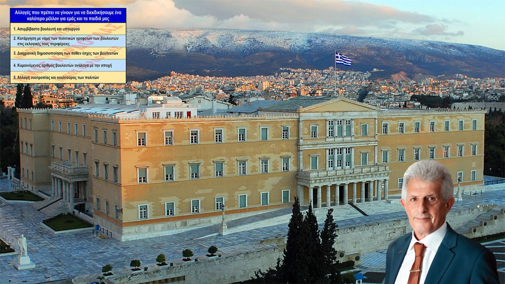 Εάν θέλουμε να διεκδικήσουμε ένα καλύτερο μέλλον για εμάς και τα παιδιά μας, θα πρέπει να αλλάξει η νοοτροπία και η κουλτούρα μας και θα πρέπει να γίνουν οι απαραίτητες θεσμικές αλλαγές, όπως το ασυμβίβαστο βουλευτή και υπουργού, η κατάργηση με νόμο των πολιτικών γραφείων των βουλευτών στις εκλογικές τους περιφέρειες, η διαχρονική δημοσιοποίηση των πόθεν έσχες των βουλευτών και ο καθορισμός του συνολικού αριθμού των βουλευτών ανάλογα με την αποχή.