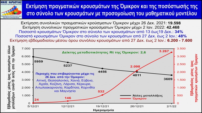 Ο πραγματικός αριθμός των κρουσμάτων της Όμικρον στην Ελλάδα δεν μπορεί να καταγραφεί, αφού δεν μπορεί να γίνει γονιδιωματική επιτήρηση για την Όμικρον σε όλα τα θετικά τεστ και ελέγχεται περίπου το 2% έως 3%. Ο πραγματικός αριθμός των κρουσμάτων Όμικρον μπορεί να υπολογιστεί μόνο με μαθηματικά μοντέλα.