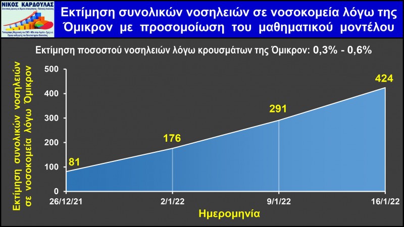 • Μέχρι τις 16 Ιανουαρίου 2022 εκτιμήθηκε ότι θα χρειασθούν νοσηλεία σε νοσοκομείο 424 άτομα που μολύνθηκαν με την Όμικρον, που σημαίνει ότι η Όμικρον δεν θα δημιουργήσει μεγάλα προβλήματα στη νοσοκομειακή περίθαλψη.