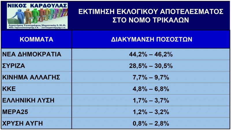 Μετά τα πρώτα αποτελέσματα, εκτιμάται ότι η διακύμανση των ποσοστών των κομμάτων στο Νομό Τρικάλων θα είναι: