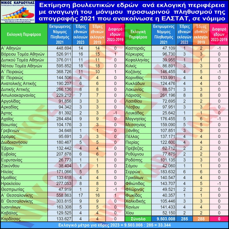 Σύμφωνα με την ΕΛΣΤΑΤ ο μόνιμος προσωρινός πληθυσμός της χώρας το 2021 ήταν 10.432.481 και ο αντίστοιχος νόμιμος πληθυσμός που εκτιμήθηκε με την παρούσα μεθοδολογία ήταν 9.503.008, ενώ στην απογραφή του 2011 ο μόνιμος πληθυσμός ήταν 10.816.286 και ο νόμιμος ήταν 9.904.286. Το μέτρο του υπολογισμού του αριθμού των βουλευτικών εδρών κάθε εκλογικής περιφέρειας, προέκυψε διαιρώντας τον νόμιμο πληθυσμό της χώρας που εκτιμήθηκε, με τον συνολικό αριθμό των βουλευτικών εδρών που κατανέμονται στις εκλογικές περιφέρειες (285 έδρες, ενώ 15 έδρες κατανέμονται στο Επικρατείας) και ήταν ίσο με 33.344.